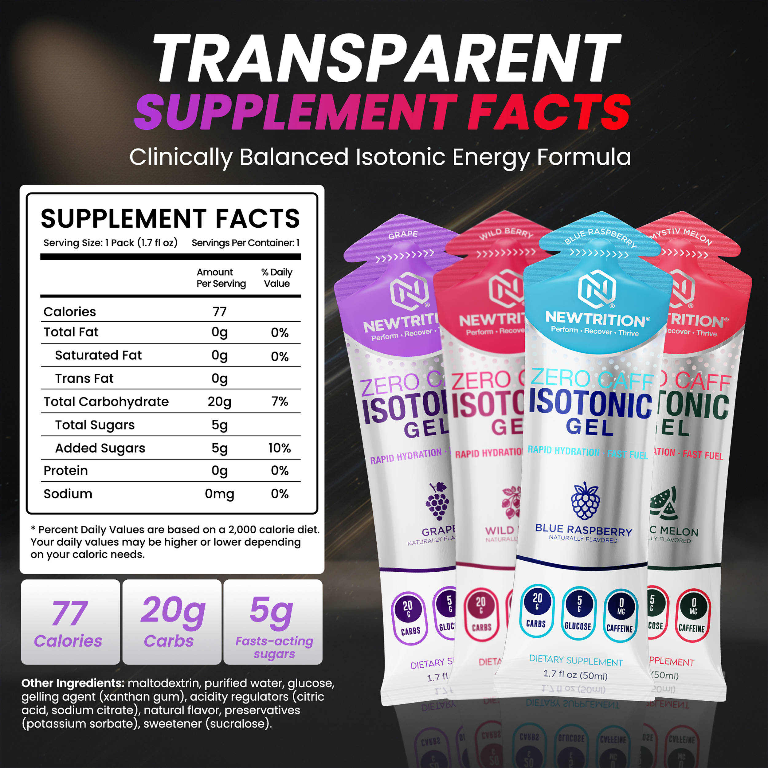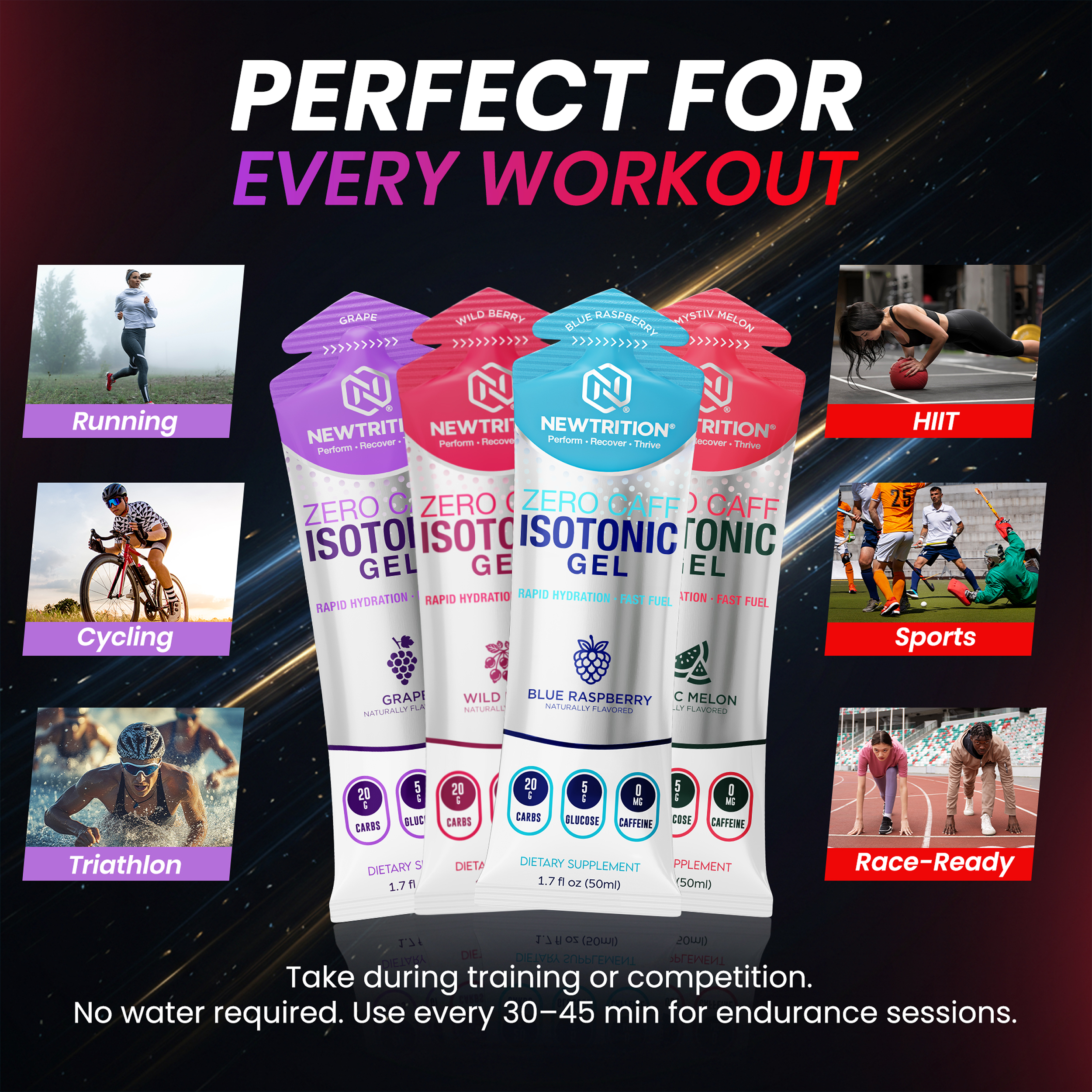 NewTrition Isotonic Gel is crafted with the highest-purity ingredients and modern hydration science. Clean, powerful, and designed for real endurance. Whether you’re racing, training, or pushing limits, this gel keeps you going — fast and comfortably.